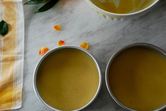 Pour the batter evening between the two greased pans. Bake for 1 hour, or until an inserted toothpick comes out clean. Place on a rack to cool. Run a knife around the edges. Once it has cooled enough for you to safely touch the pans, pop a cake out, peel off the parchment paper, flip over, and place it back on the rack to cool completely.