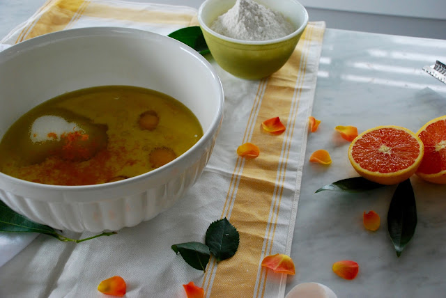 Combine your eggs, sugar, olive oil, milk, liqueur, zest and orange juice, then give it a good whisk.